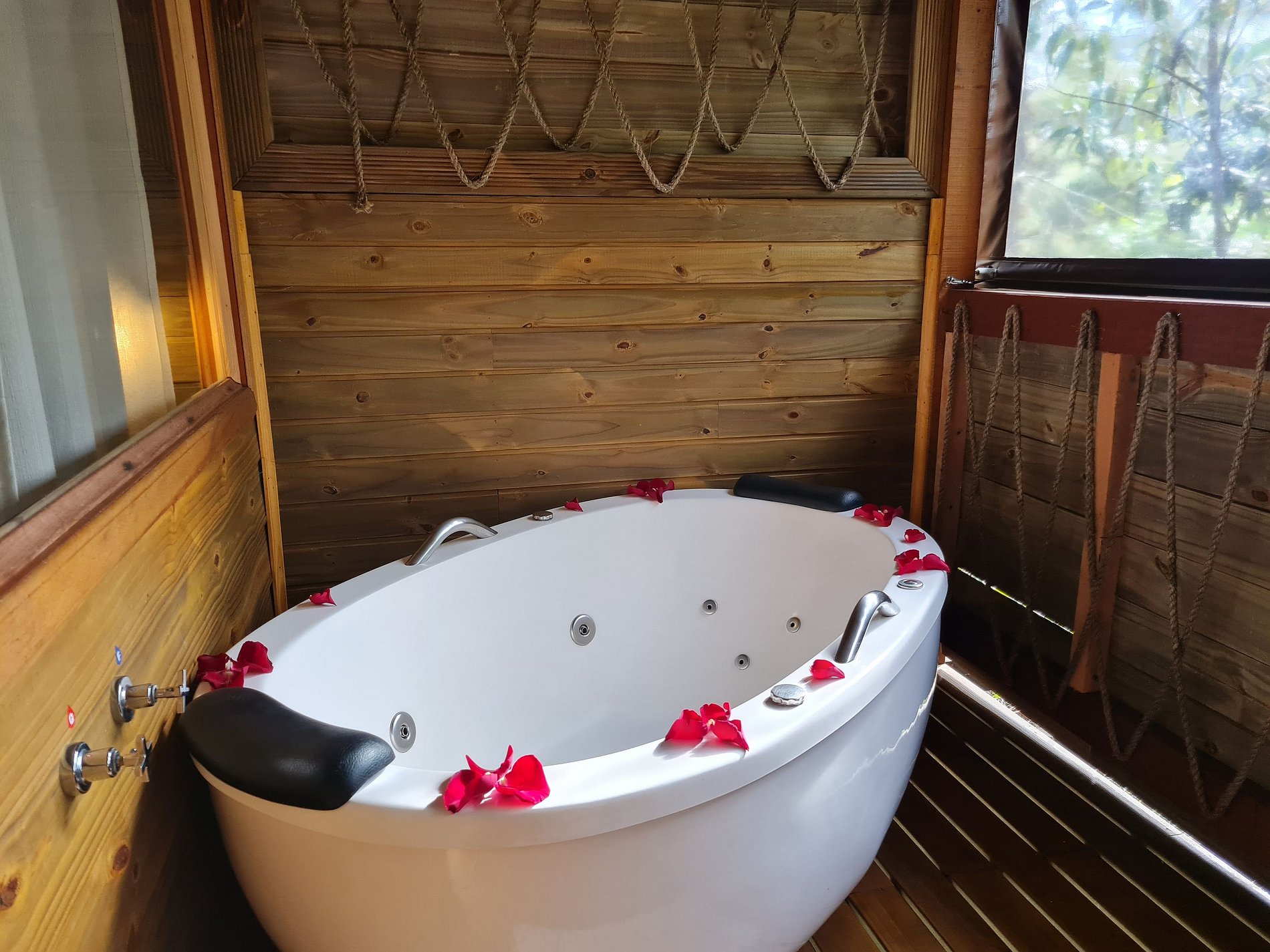 Privativa e inteira para até 2 hóspedes, espaçosa 28m2, entrada independente com vista para o jardim, um lindo com uma vista privilegiada para a mata nativa (que tem uma pequena parte aberta na frente, mas, pode ser fechada com uma lona transparente, caso queira ). No deck, ainda temos uma banheira de hidromassagem dupla moderna, uma mini copa com pia, fogão, mesa com cadeira e utensílios básicos de cozinha, para que possam preparar o seu café e refeições básicas enquanto curtem a mata o som da natureza, além da visita de lindos pássaros e esquilos.