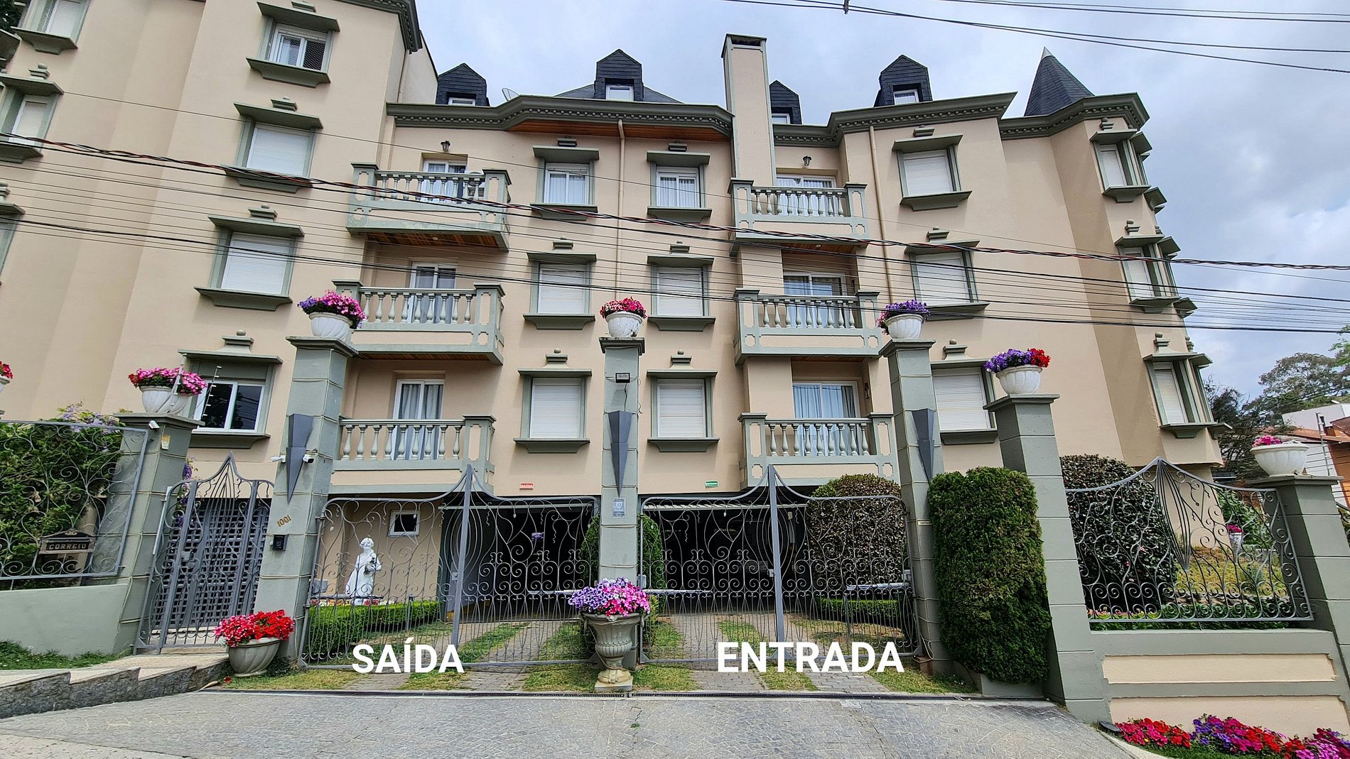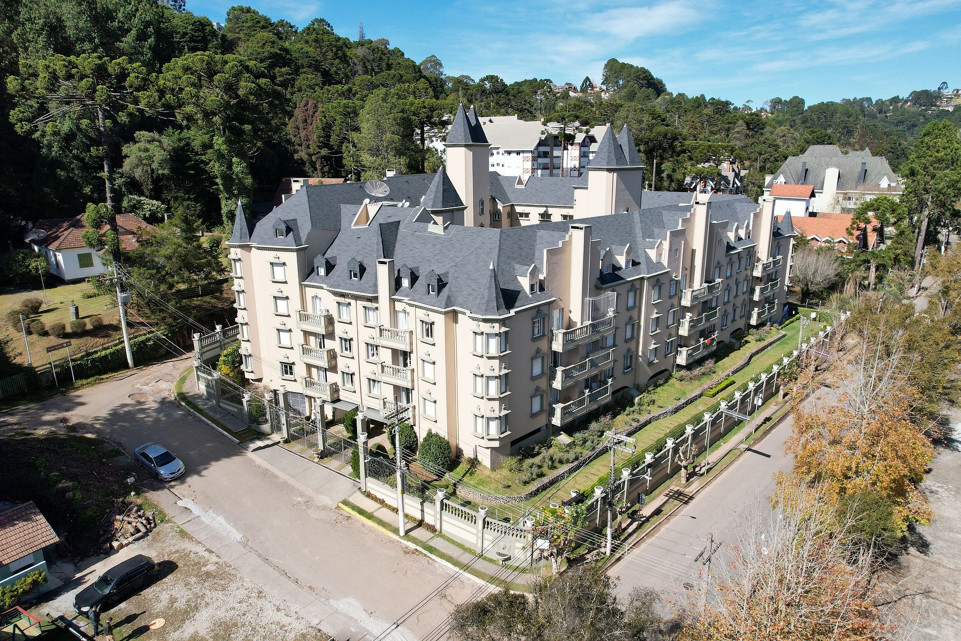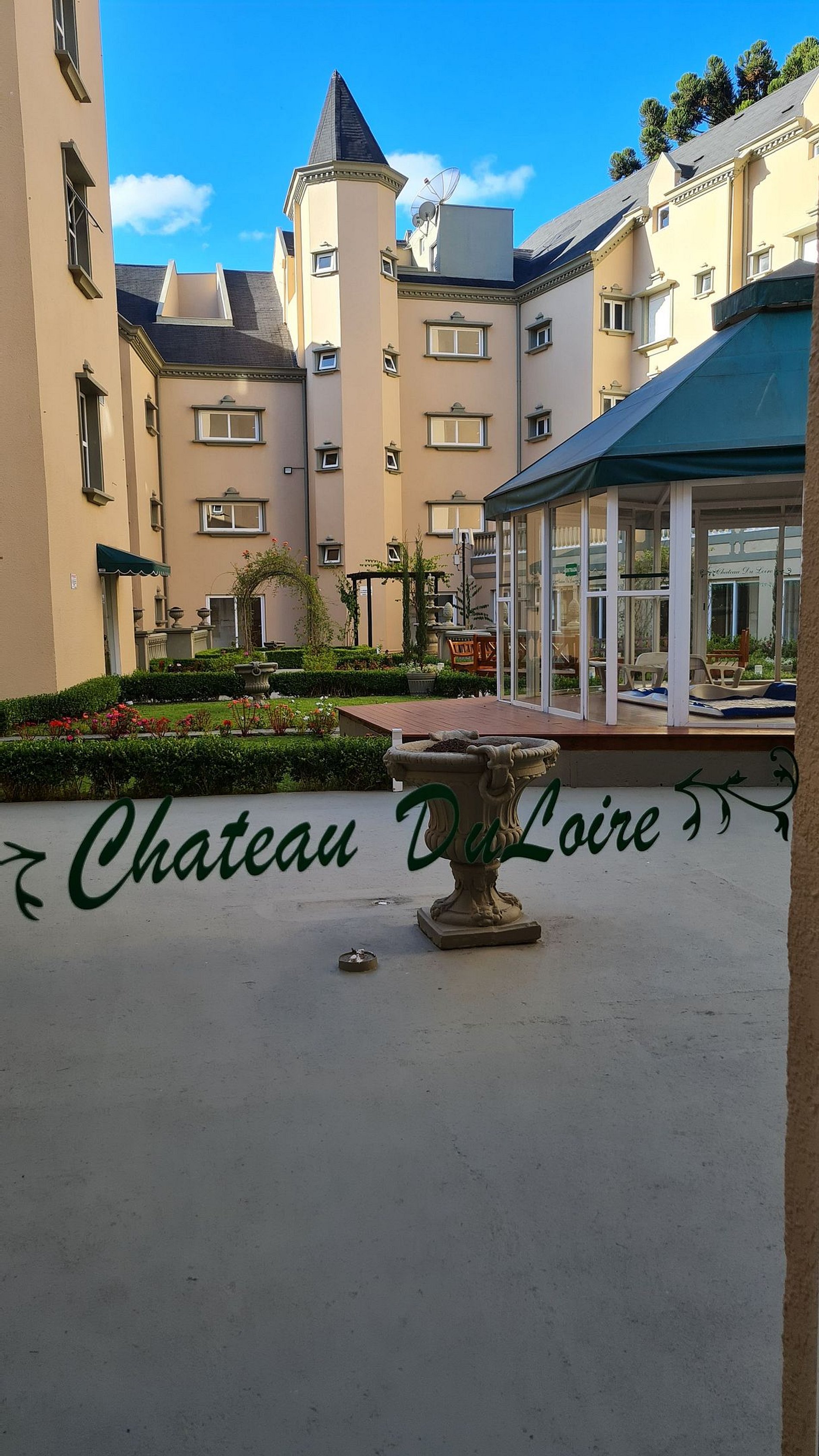 Inspirado nos elegantes castelos franceses do Vale do Loire, o condomínio apresenta uma arquitetura encantadora. Conta com estacionamento gratuito, jardim central com bancos, sala de jogos e elevador, proporcionando mais conforto aos hóspedes.