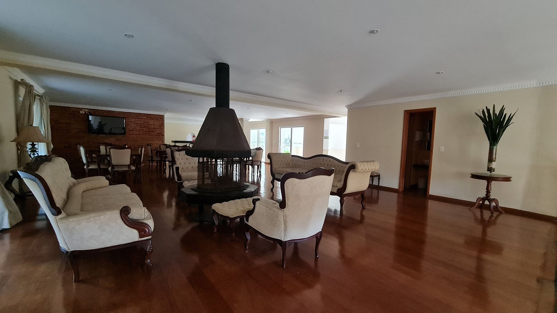 Lareira a álcool. Preferimos lareira à lenha, mas nada que desabone a propriedade.