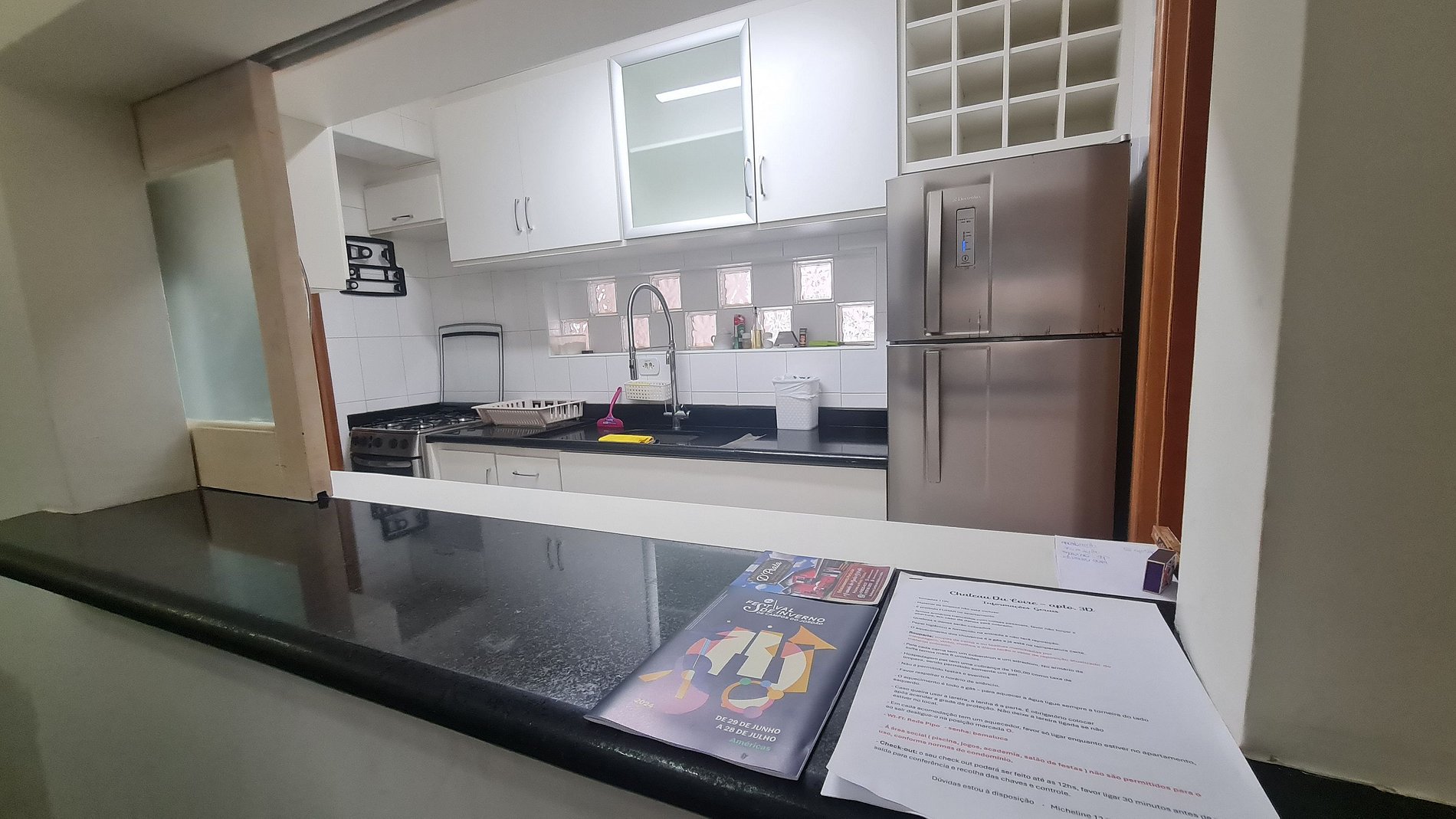 O inventário e as normas do apartamento e do condomínio estão disponíveis sobre a bancada da cozinha.