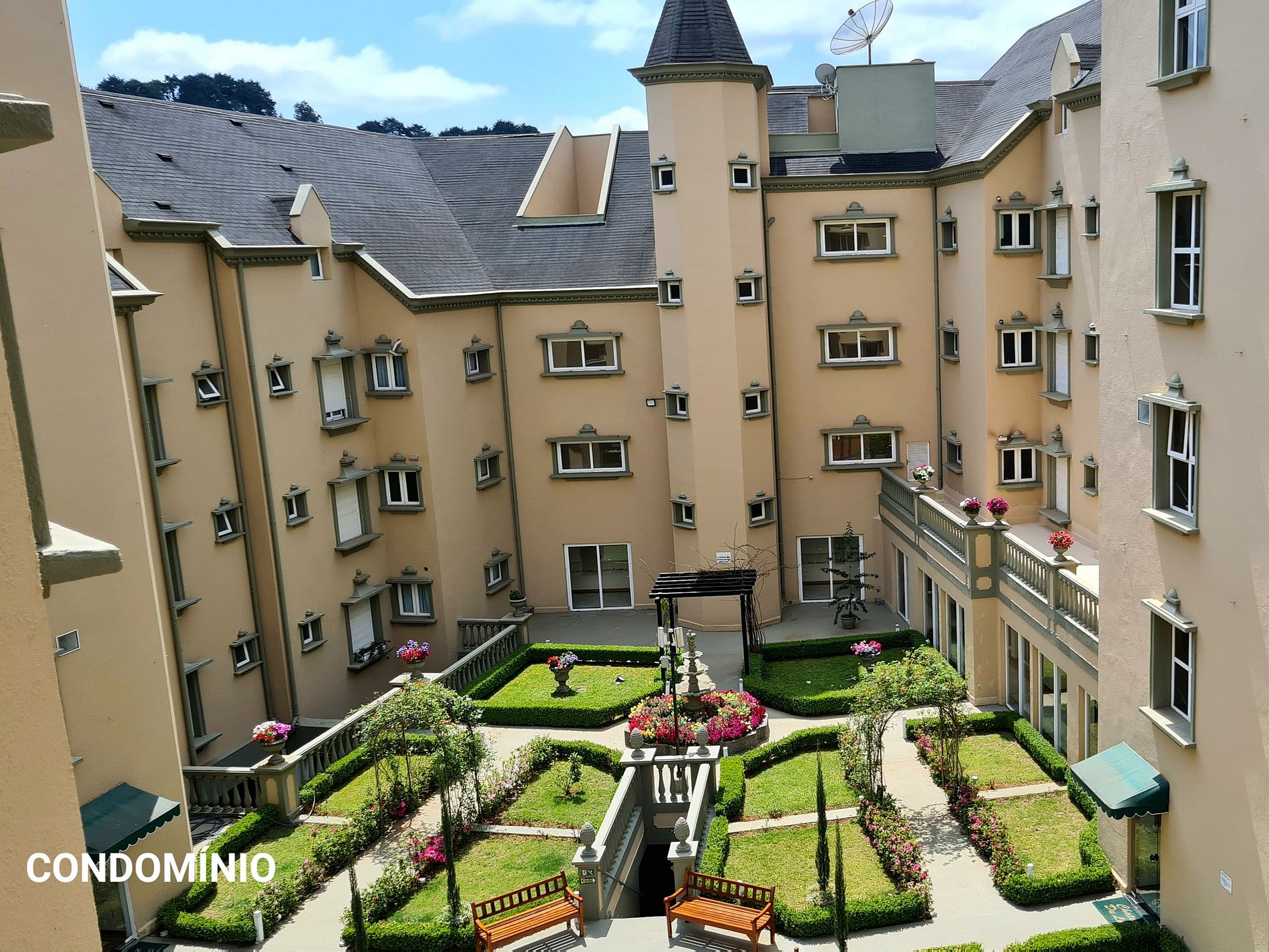 O condomínio tem uma bela arquitetura que lembra os castelos da França e estamos a menos de 1 km do centro turístico da cidade de Campos do Jordão, o famoso "Capivari" em uma avenida principal toda asfaltada e iluminada . Dá para ir a pé para o centro turístico.